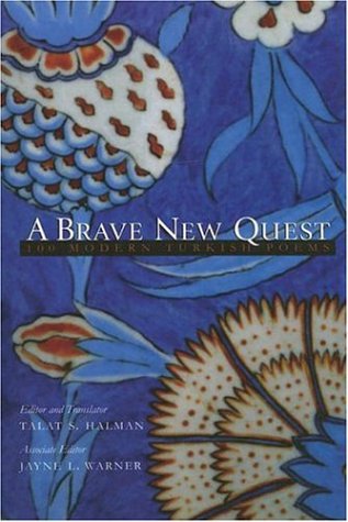 "A Brave New Quest: 100 Modern Turkish Poems" is a beautiful , rare jewel . Illuminate by a sapphire blue with white, flame and peacock cover photographed detail from Iznik tile in the Rutwem Pasha Mosque, in Istanbul, this is the only anthology of modern Turkish poetry translated into English. Coming from a nation where virtually everyone is a poet, the anthology contains a vibrant, varied and sophisticated sampling of modern Turkish poetry. Here you will find poems about fear, death, love, nature, change, bewilderment of the senses, transfiguration, cruelty and social injustice, pain, hope, laughter, tears, joy and despair, and above all passionate longing. Poets whose work are included in this translation include Nazim Hikmet, Fazil Husnu Daglarca,Orhan Veli Kanik, Behdet Necatigil, Attila Ilhan, Melih Cevdet Anday, Edip Cansever, Ece Ayhan, Kemal Ozer, Ulku Tamer, and so many more. Each poetic work is selected and translated with loving care for the fine imagery, the lyrical syllables even in English. Editor Talat S. Halman has many starry credentials to explain the fine workmanship in "A Brave New Quest." Besides being a leading translator of Turkish literature and many books about modern Turkish playwrights and poets, he is an award winning avatar for Turkish culture and literature. Besides translating major works of English into Turkish and vice versa, he is an accomplished playwright, poet, and writer. Awards he has received include Columbia University's Thornton Wilder Translation Prize, the 1999 Service Award from the Turkish Academy of Sciences for enhancing the recognition of Turkish literature, and the Distinguished Service Award from the Ministry of Foreign Affairs in 2000. His offering in "A Brave New Quest" seems equivalent to a prism that allows the rainbow of beauty and complexity of modern Turkish poetry to sing, quietly, to an English speaking audience. It is very difficult to select a quotation from such a fine collection, but here is one choice from a poem called (untitled) by Nazim Hikmet: